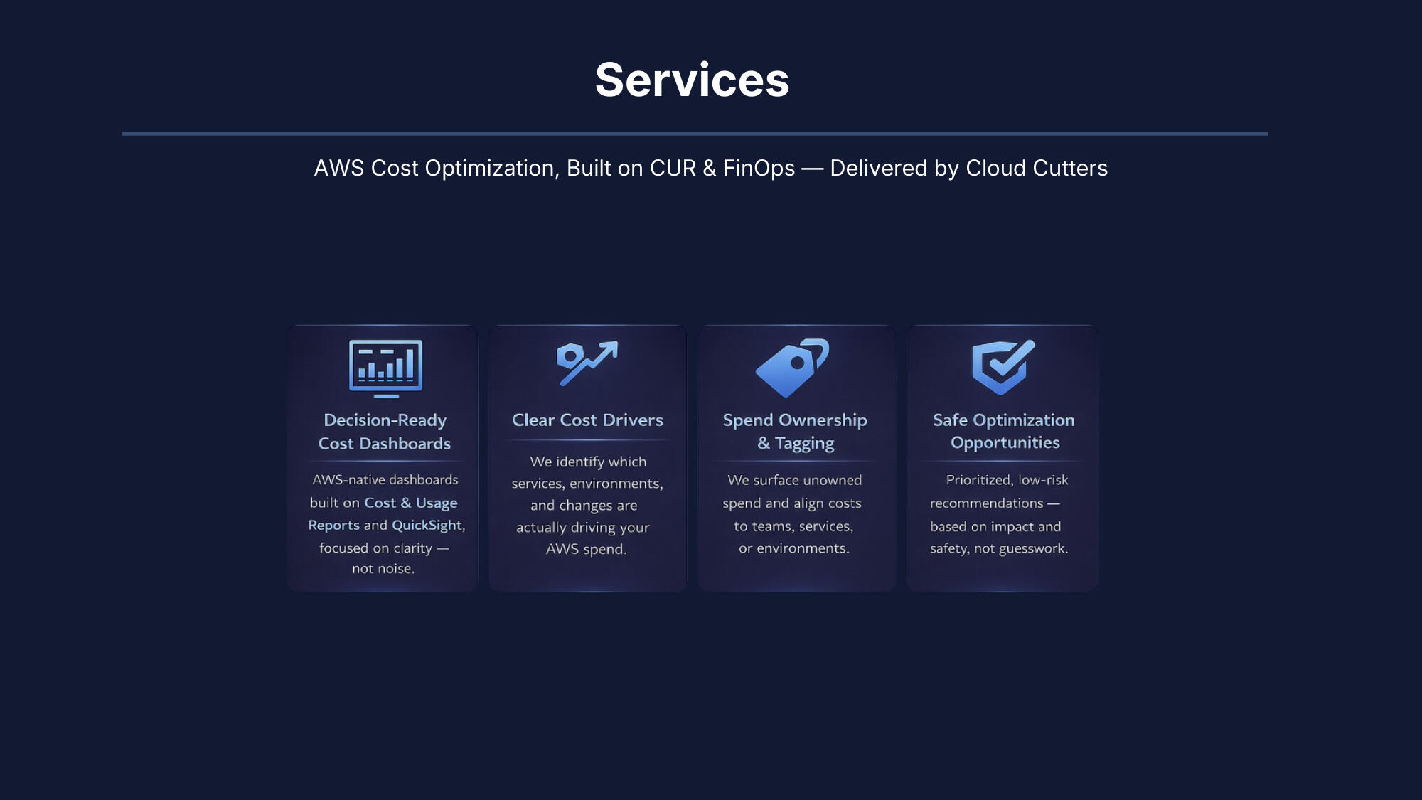 A short walkthrough of how we approach AWS cost visibility, FinOps dashboards, and prioritized optimization — tailored to your environment.